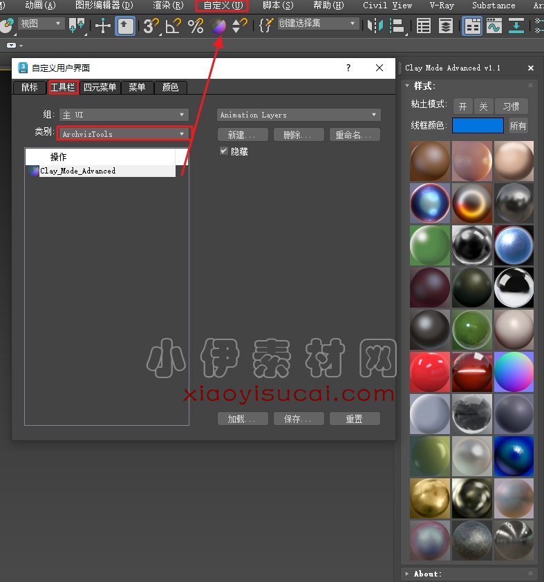 类别:“ArchvizTools”并将“Clay Mode Advanced”拖动到工具栏。